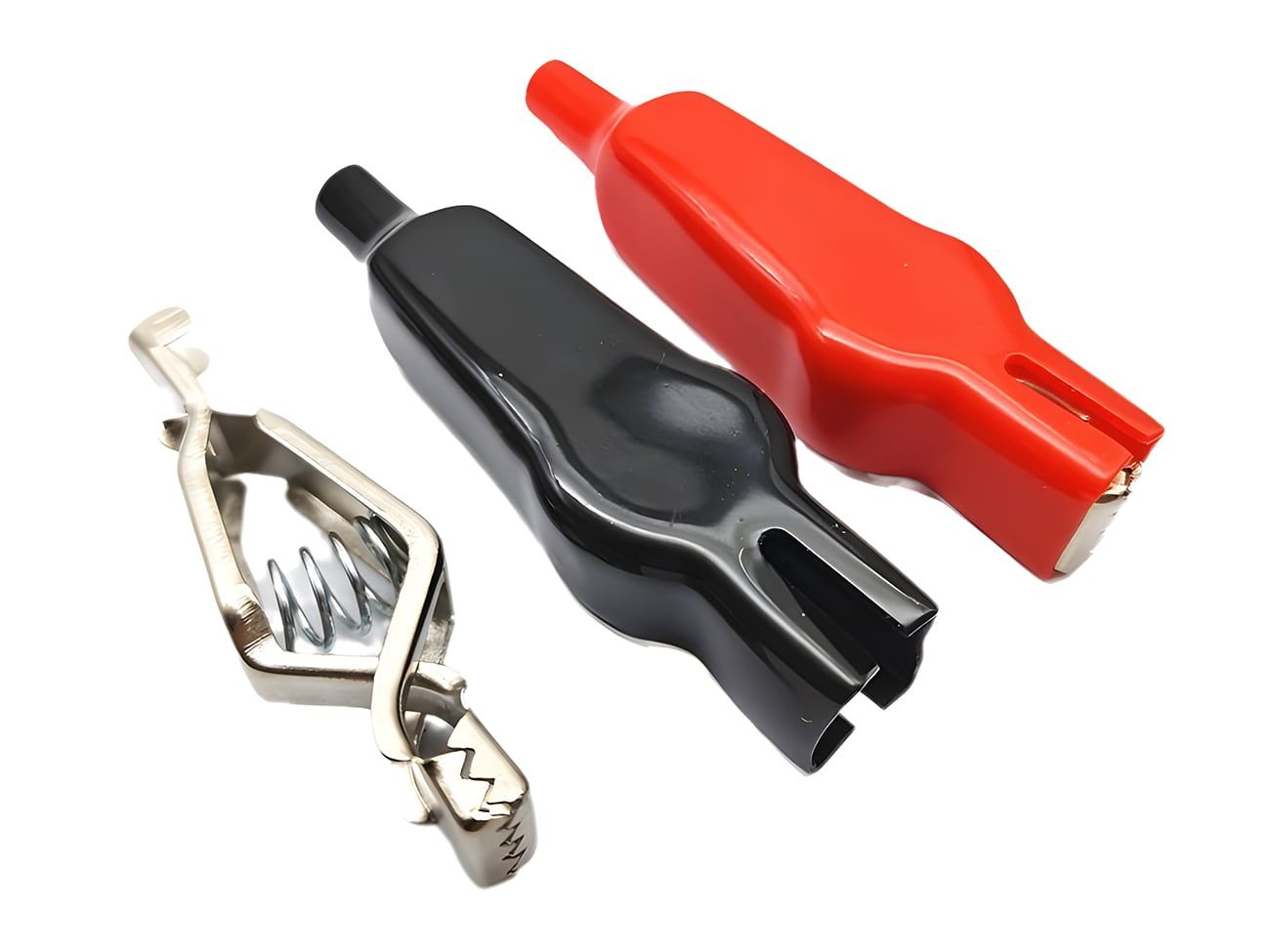 Each clip features a durable metal jaw with strong spring tension and insulated covers in red and black for polarity identification. Ideal for use in test leads, DIY electronics, automotive, and battery charging setups.