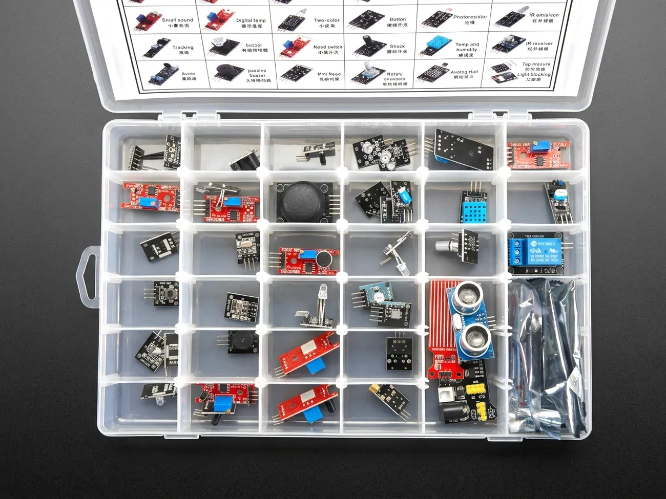 Build smarter electronics projects with this 45-in-1 Sensor Module Kit featuring motion, temperature, humidity, sound, light, magnetic, distance, and control modules in one organized set.