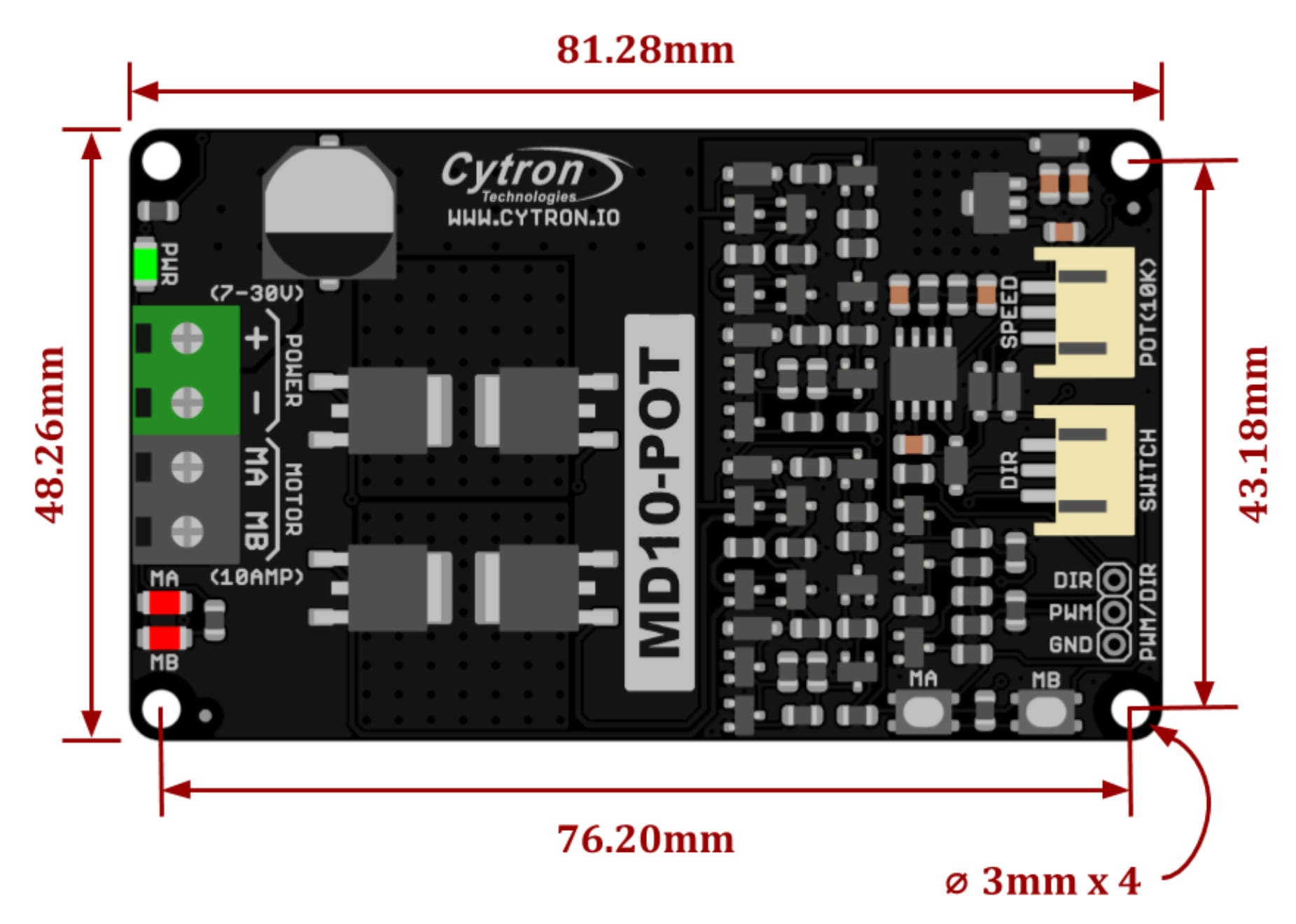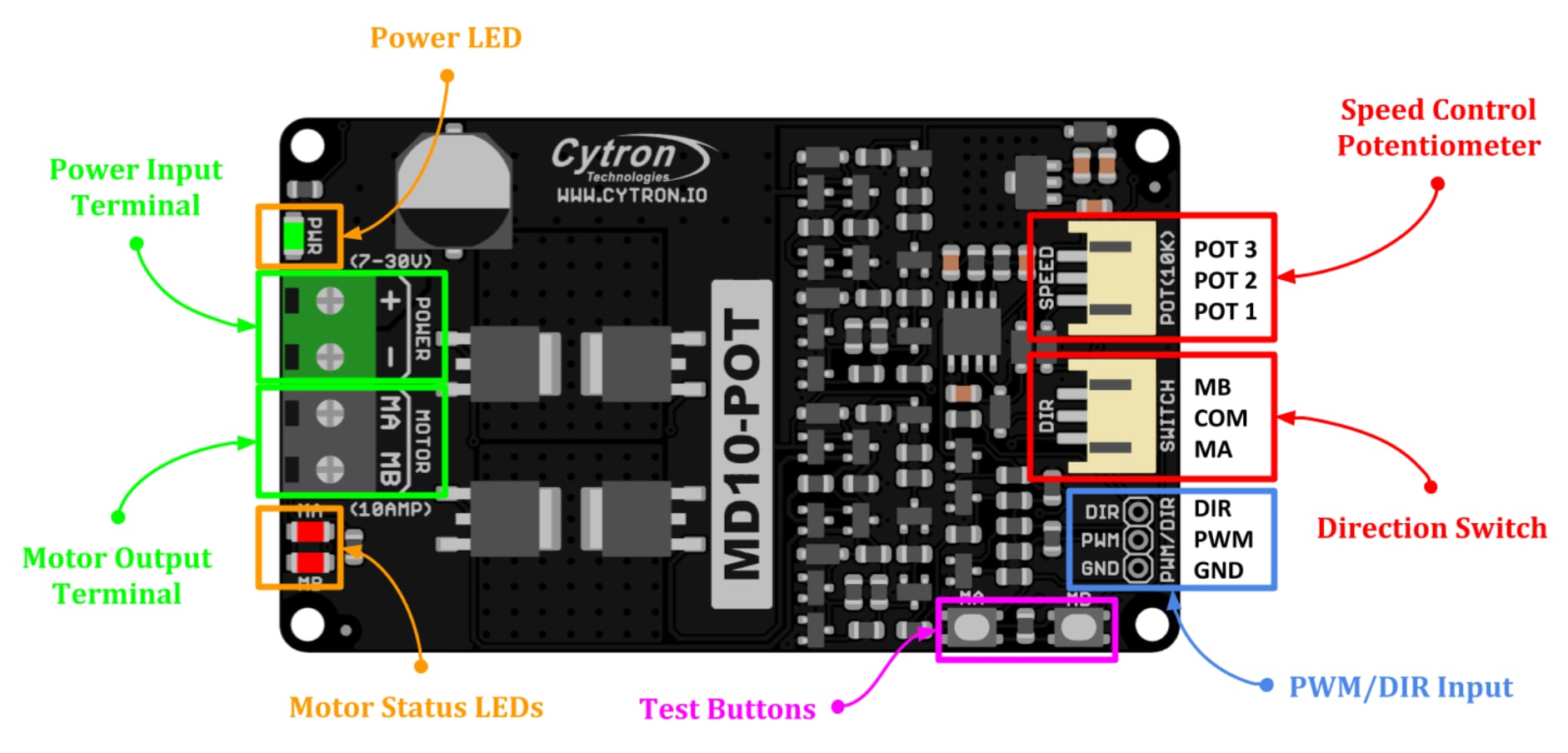 Pinout and layout for Cytron MD10-POT Motor Driver.