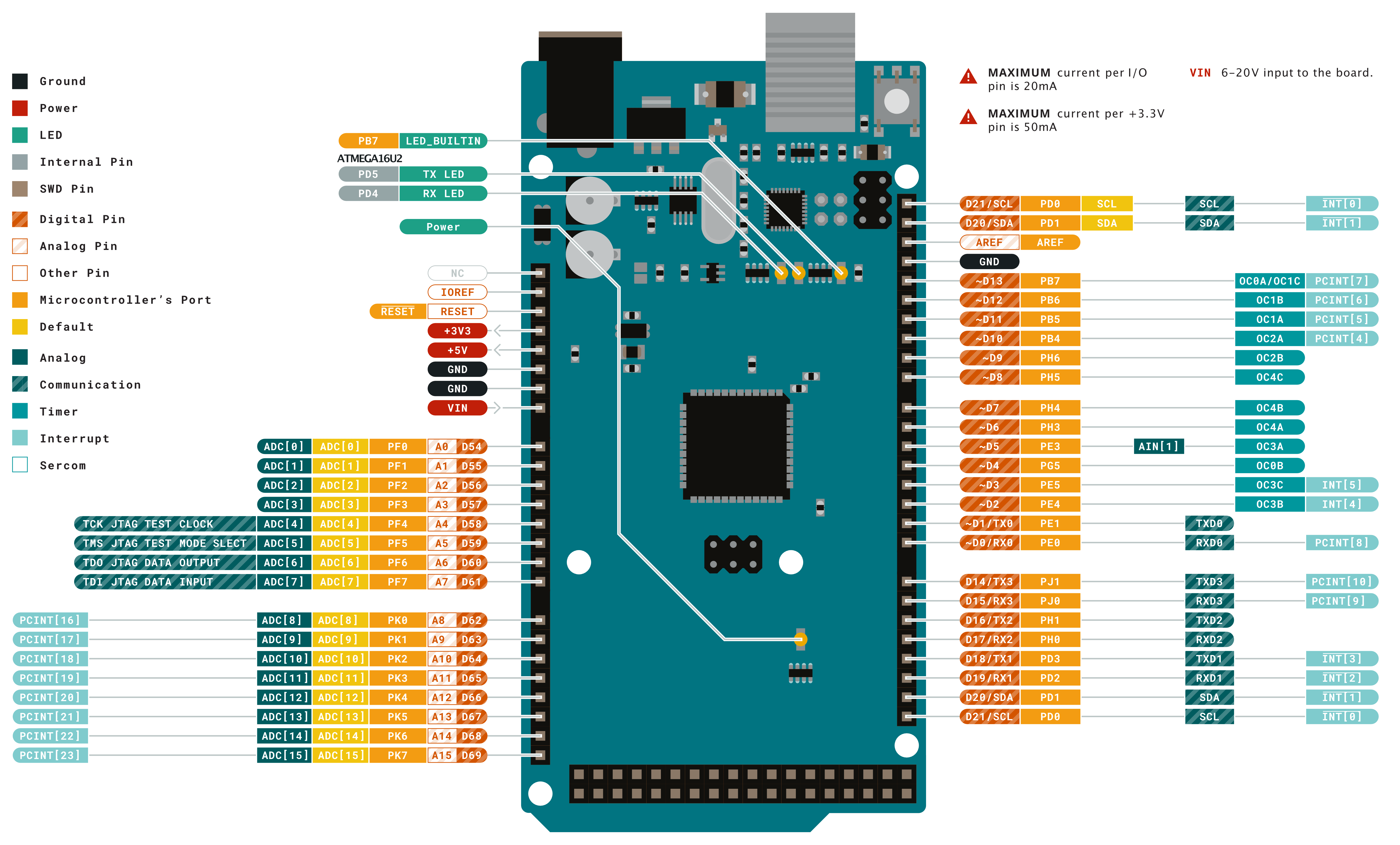 | Pins | 54x Digital I/O Pins 16x Analog Input Pins 15x PWM Output Pins |