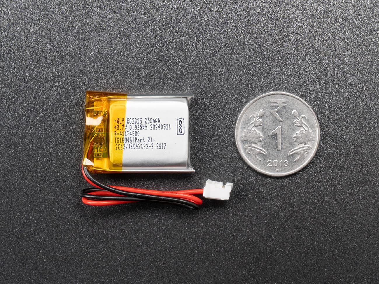 This is a 3.7V 250mAh Lithium-ion Polymer battery which outputs voltage ranging from 3.7V to 4.7V when completely charged. It comes with a 2-pin JST-PH connector, 100mm wire length and has a built-in PCM (Protection Circuit Module) which prevents the battery from over charging and over discharging by cutting off the output voltage at 2.75V. PCM also protects against output shorts.