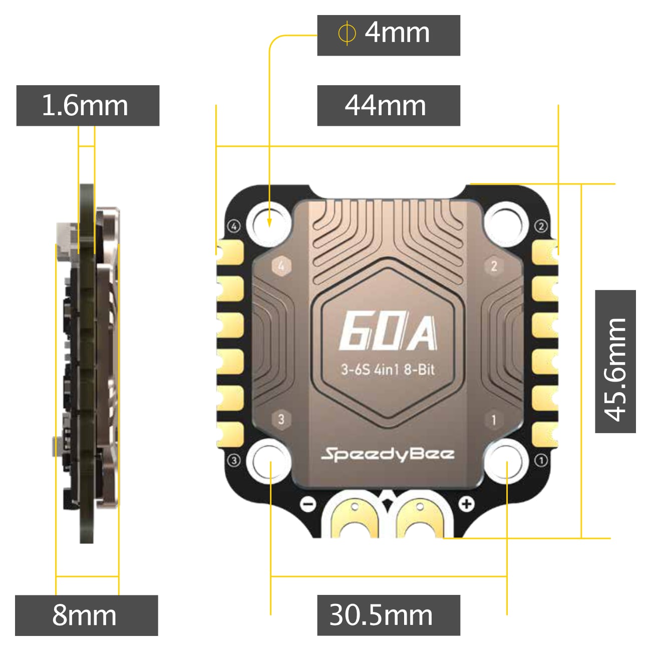 This stack features a built-in Bluetooth module, enabling seamless wireless configuration of the flight controller and ESC through the SpeedyBee app. The 4-in-1 ESC supports a continuous current of 60A per channel and can handle bursts of up to 80A for 10 seconds, protected by a robust aluminum heat sink for efficient cooling.