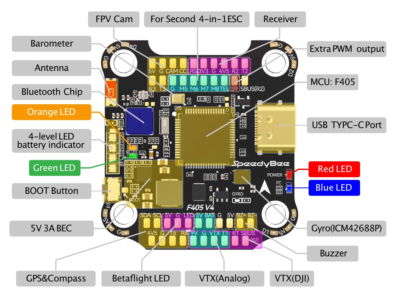 Feature rich SpeedyBee F405 V4 Flight Controller and ESC.