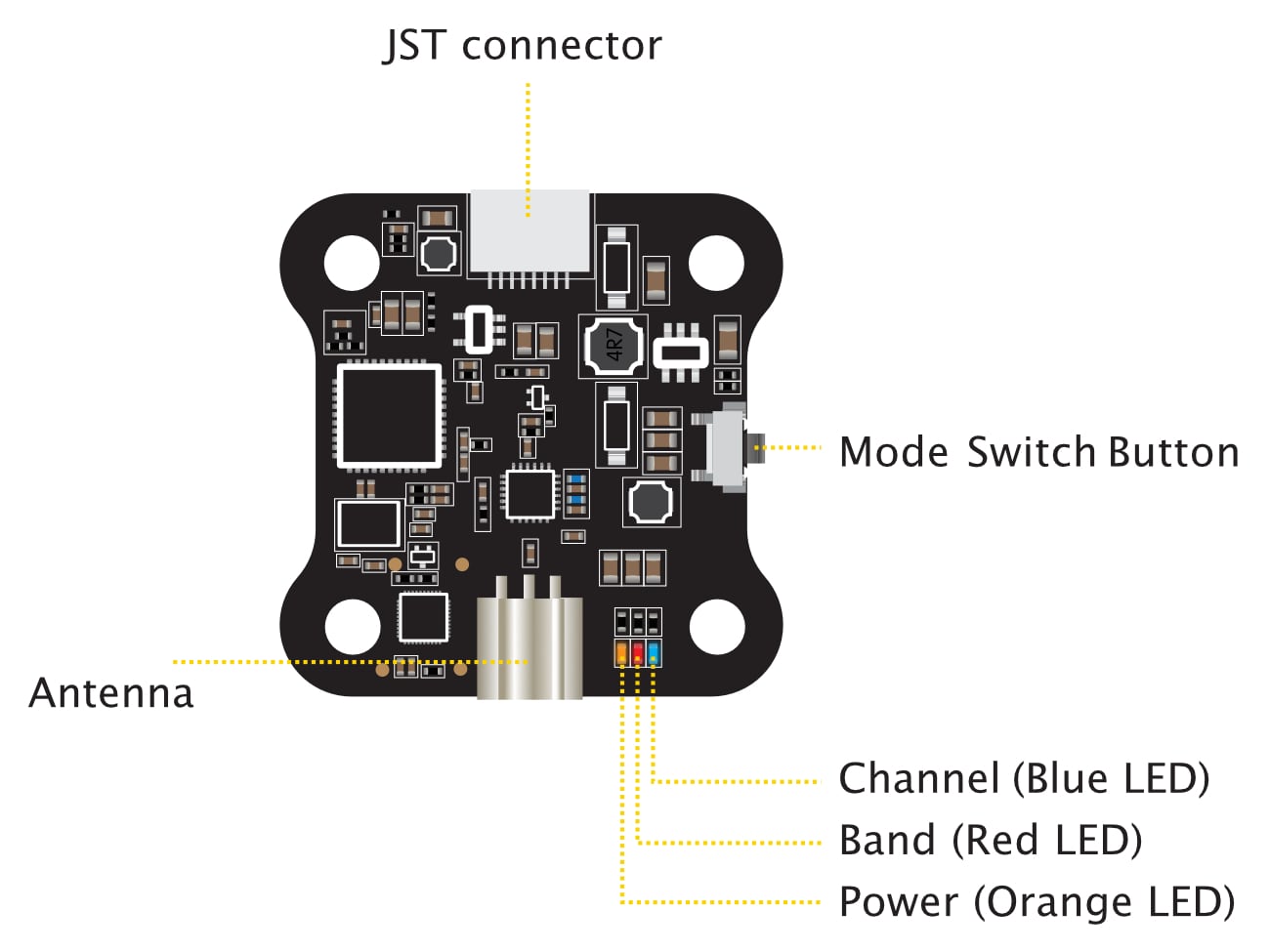 With a compact PCB size of 28mm x 28mm and a 20mm x 20mm mounting pattern, the TX800 fits seamlessly into most drone builds. The lightweight design, weighing just 5.6 grams (excluding the antenna), ensures minimal impact on flight performance.