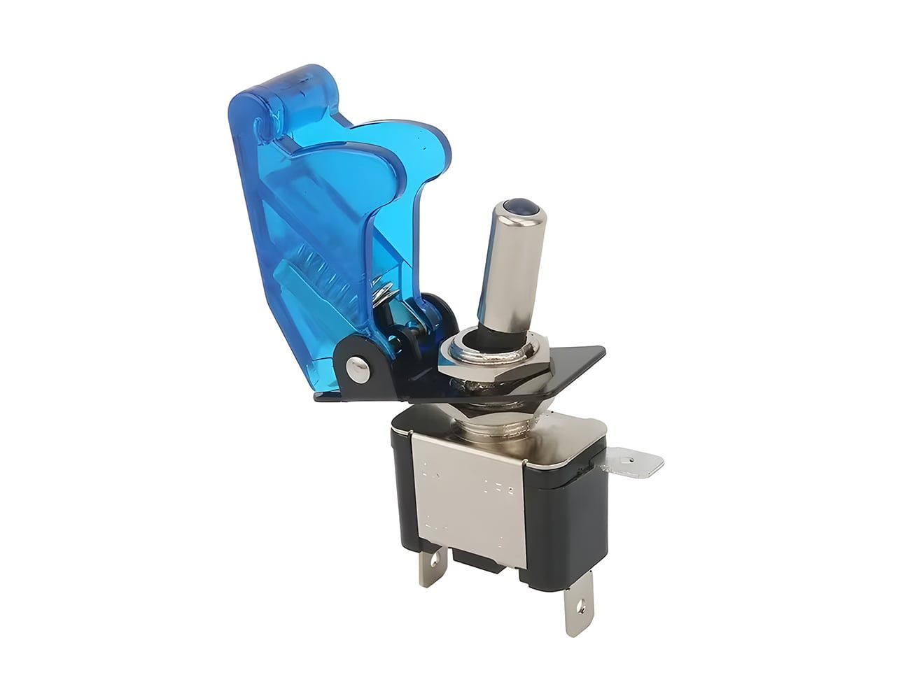 The ASW-07D Toggle Switch with LED Light and Cover brings both functionality and style to your control panels. Equipped with a transparent blue flip cover and an integrated LED indicator, this rugged switch adds a professional racing-style touch to your project — whether it’s for automotive, industrial, or DIY electronics.