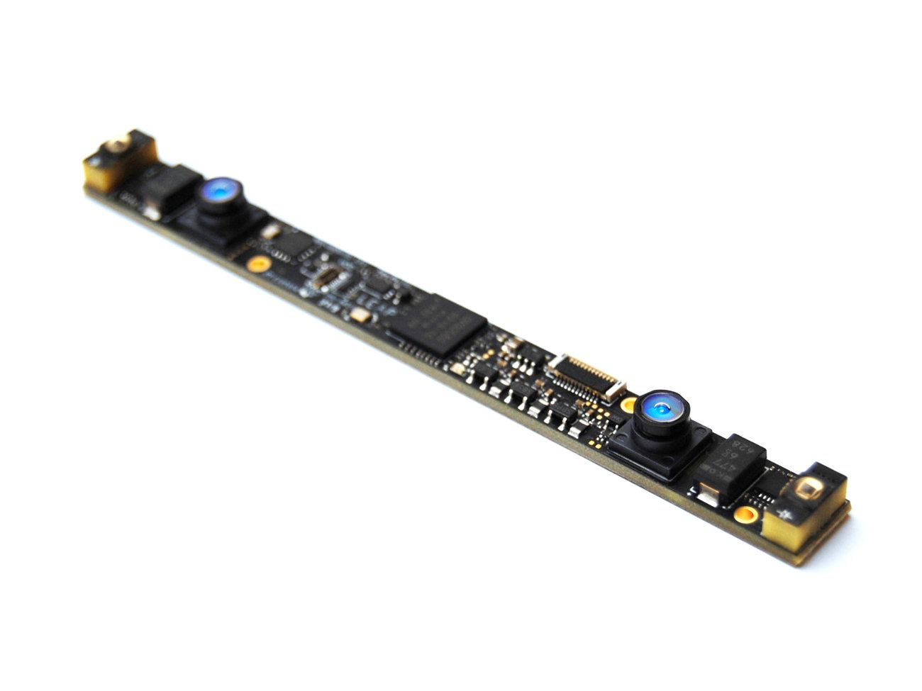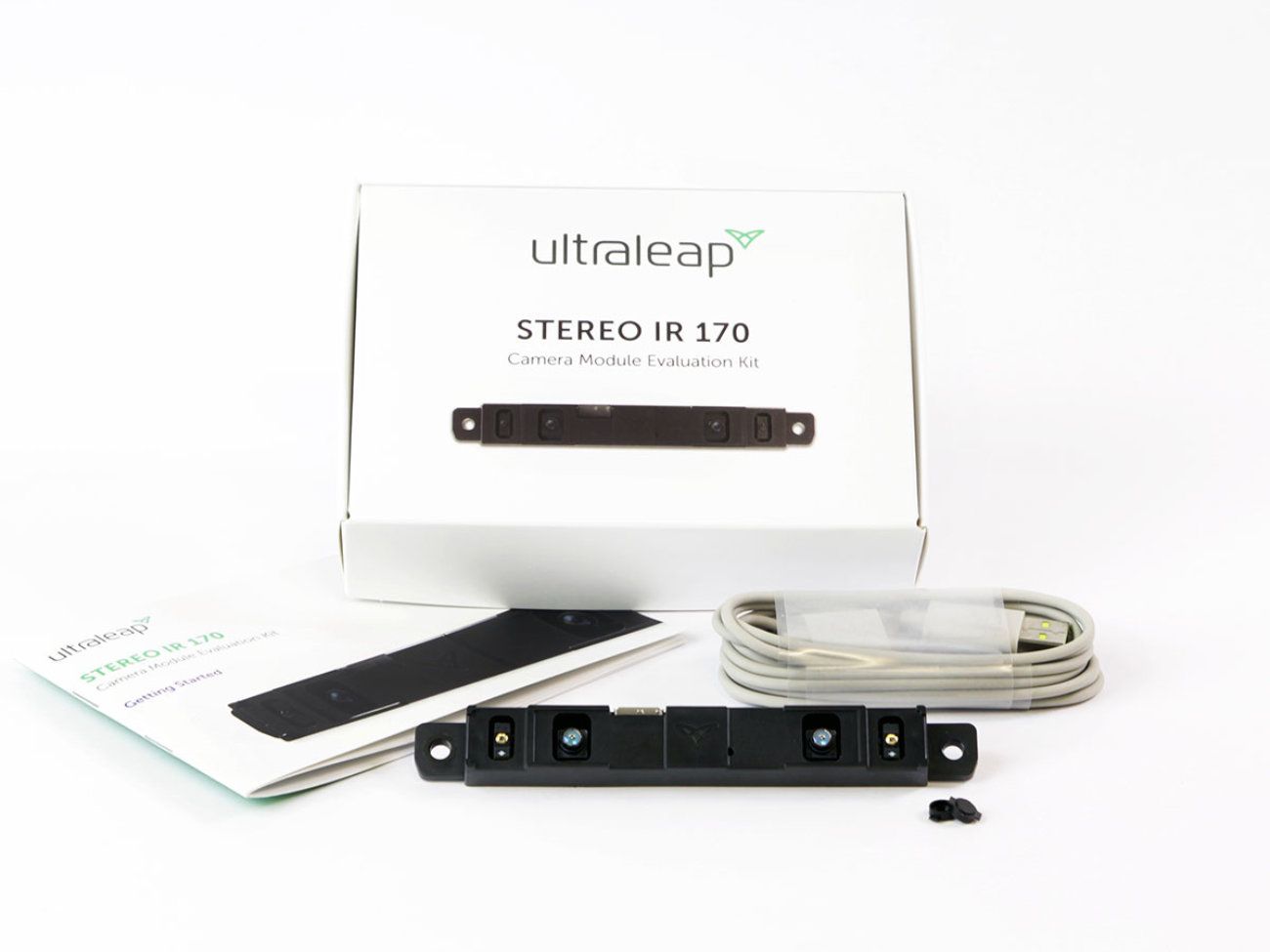 The Stereo IR 170 Evaluation kit consists of the Ultraleap Stereo IR 170 camera module in a plastic housing with USB header, allowing for easy plug-and-play evaluation.