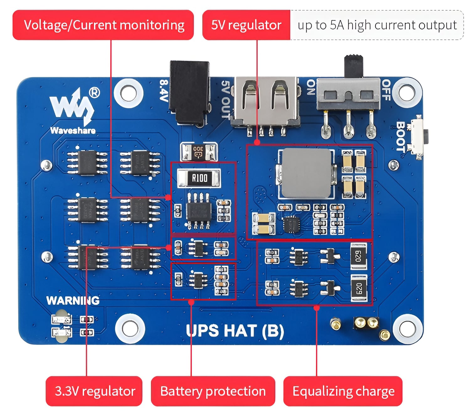 Technical specifications for UPS Base HAT (B) for Raspberry Pi, Supports 18650 Li-Ion Battery.